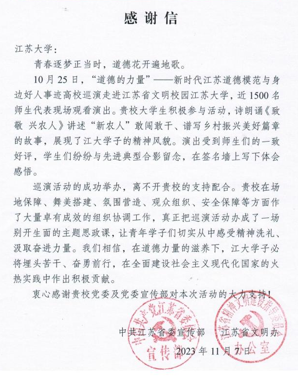 近日,江苏省委宣传部、省文明办向我校发来感谢信,对我校在“道德的力量”——新时代江苏道德模范与身边好人事迹巡演走进多宝网页版中所做工作提出高度赞扬,对我校为全省精神文明建设作出的重要贡献表示衷心感谢。