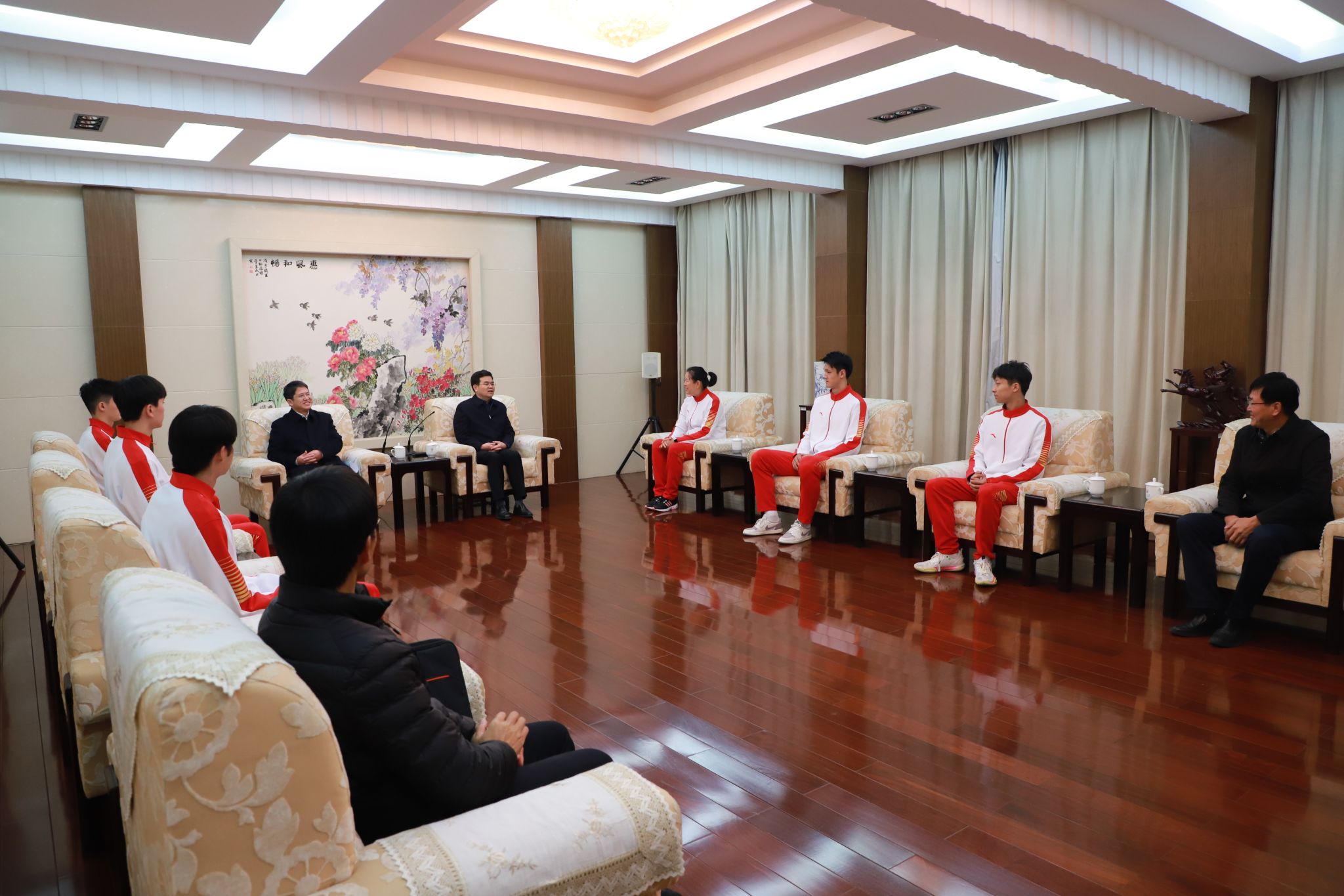 11月20日下午,校党委书记李洪波,校党委常委、副校长、校体工委主任邹小波在行政一号楼会议室接见获得第一届全国学生(青年)运动会男排冠军的我校教练员和运动员。