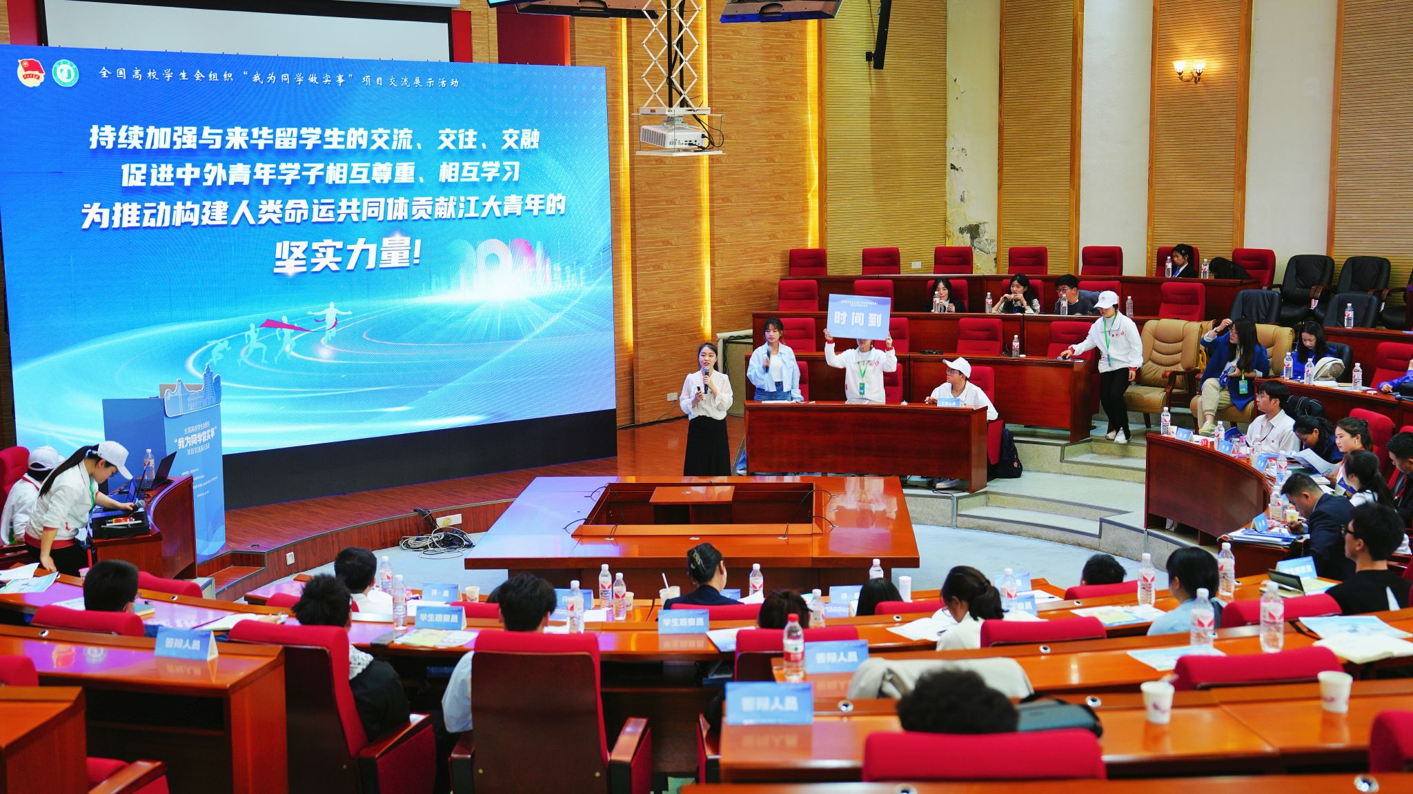校研究生会主席团成员牧佳霖和医学院学生会主席团成员谷子昱,面向评委和学生观察员进行答辩;通过现场布展、知识宣讲、互动游戏、产品交流等环节,充分展示我校学生会组织“我为同学做实事”项目积极向上的青春风采。在“敢想敢为大讨论”学联学生骨干沙龙、全国学联和升级学联专题联学活动中,2位项目团队成员认真聆听专题讲座,与全国高校学生会组织骨干们互相交流学习。