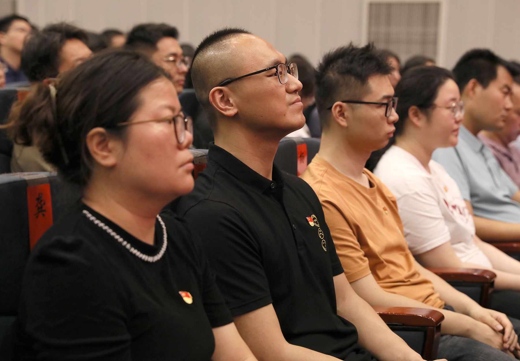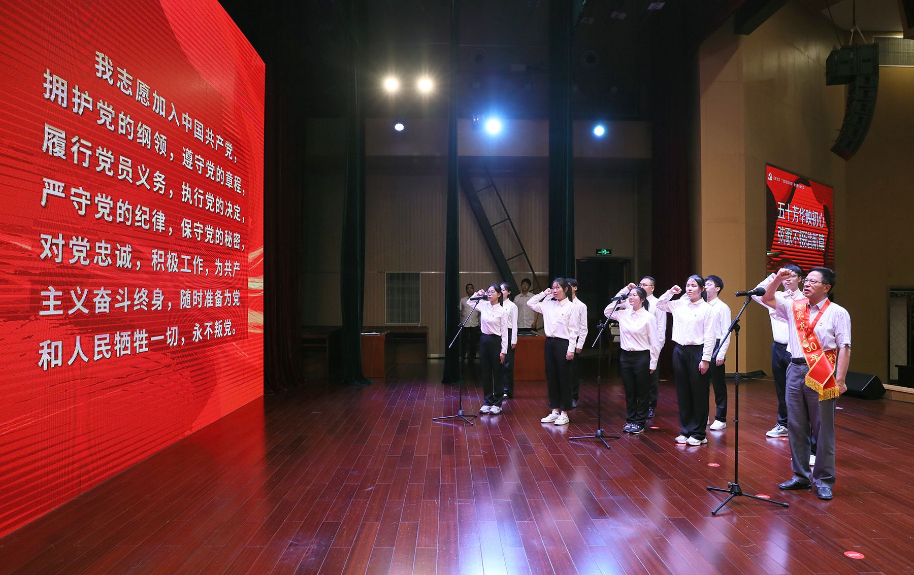 “光荣在党50年”党员代表,管理学院党委、财经学院党委、附属医院党委、机关党委教职工党员代表,新党员代表等400余人参加活动。(党委组织部)