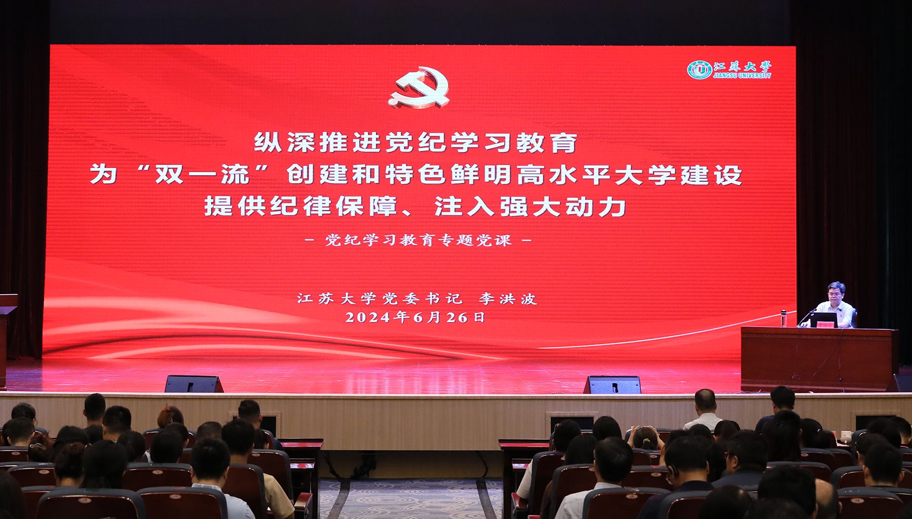 “光荣在党50年”纪念章颁发仪式后,李洪波以《纵深推进党纪学习教育,为“双一流”创建和特色鲜明高水平大学建设提供纪律保障、注入强大动力》为题讲授专题党课,他围绕“中国共产党纪律建设的历史演进”“《条例》修订的关键重点”“推动党纪学习教育走深走实、见行见效的主要举措”等方面,全面回溯了党的纪律建设的百余年历程,深刻阐明了纪律严明是党的光荣传统和独特优势,详细解读了新修订《条例》的主旨要义和规定要求,并对着力推动党纪学习教育深化内化转化工作提出了明确要求。