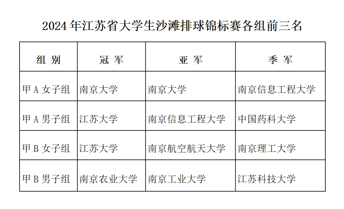 本次比赛按甲A(高水平运动员组)男、女,甲B(普通大学生组)男、女四个组别进行。多宝网页版沙排队参加甲A男子、甲B女子组比赛。运动员克服暴雨与高温天气的不利影响,团结协作,顽强拼搏,向大家展示了一出出精彩的体育盛宴。经过四天的紧张激烈比赛,多宝网页版获得甲A男子组、甲B女子组两个冠军,南京大学获得甲A女子组冠军,南京农业大学获甲B男子组冠军。