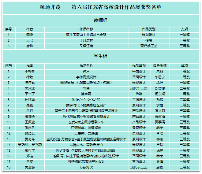 近日,由江苏省教育厅主办的“融通并茂——第六届江苏省高校设计作品展”评审结果揭晓。我校共有21件作品获奖,其中教师组一等奖2项、三等奖1项,学生组一等奖3项、二等奖4项、三等奖11项。