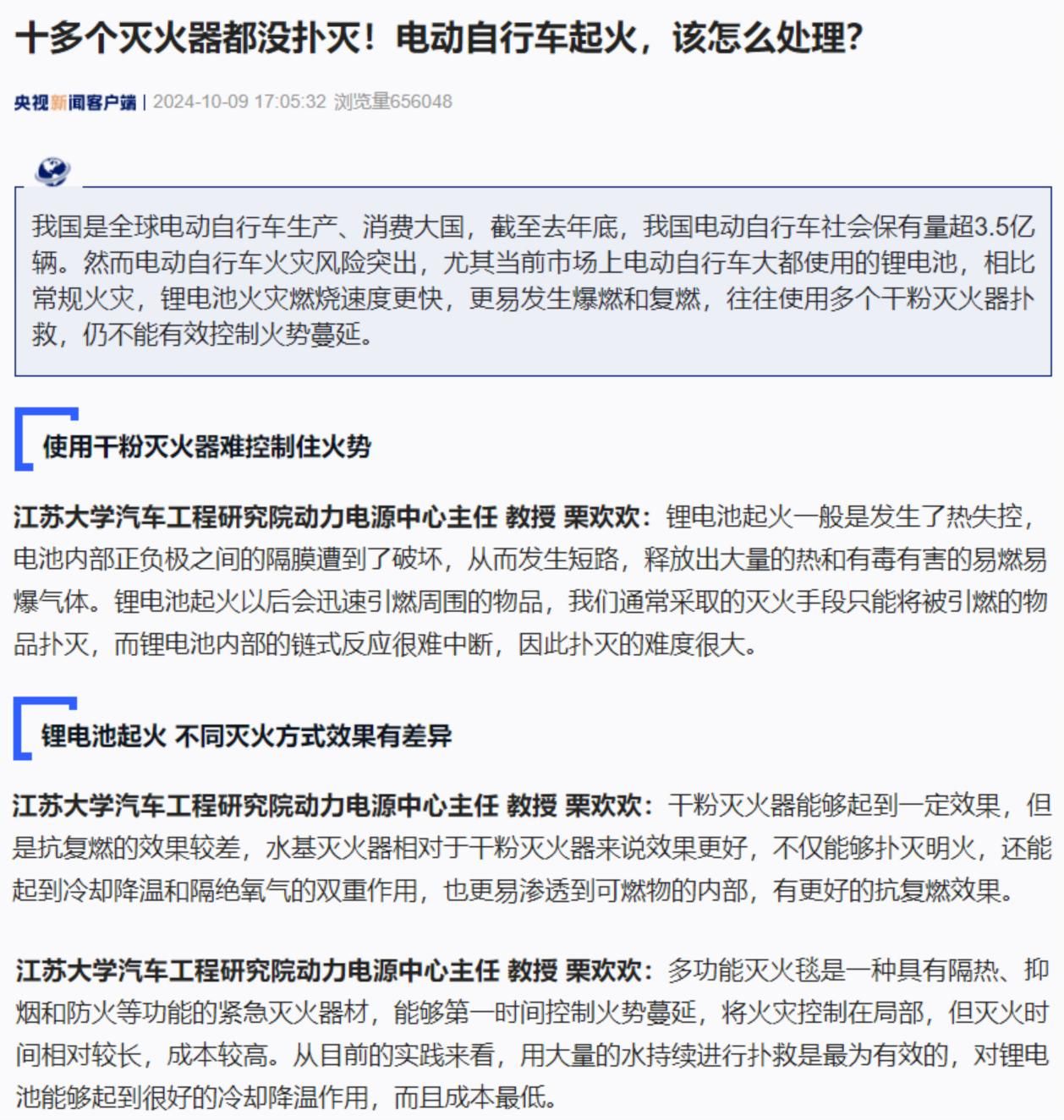 报道中,栗欢欢对锂电池起火机理、内部链式反应进程等进行了讲解,揭示了锂电池火灾扑灭难度大的原因;通过对比干粉灭火器、水基灭火器、多功能灭火毯、大量水持续扑救等不同灭火方式的优劣,为选择最优灭火方式提供宝贵建议,将自身所从事的锂电池安全研究成果转化为服务社会消防安全建设的实践指导,提升了社会整体安全意识。(汽车工程研究院)