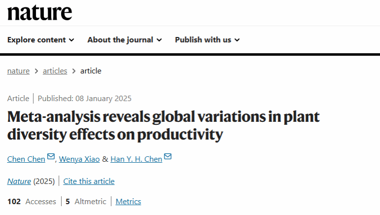近日,国际顶级学术期刊《自然》(Nature)发表了题为Meta-analysis reveals global variations in plant diversity effects on productivity的研究论文。该论文由加拿大湖首大学(Lakehead University)、多宝网页版及中国科学院植物研究所等多家单位联合完成。中科院植物研究所副研究员陈晨为论文第一作者,多宝网页版环安学院副教授肖文娅为论文第二作者,陈晨与加拿大湖首大学教授Han Y.H. Chen为论文共同通讯作者。
