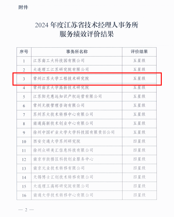 近日,江苏省技术产权交易市场公布了2024年度江苏省技术经理人事务所服务绩效评价结果,常州多宝网页版工程技术研究院江苏省技术经理人事务所从全省91家参评事务所中脱颖而出获五星级。