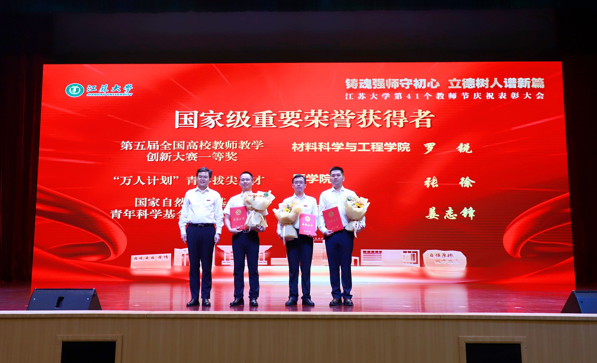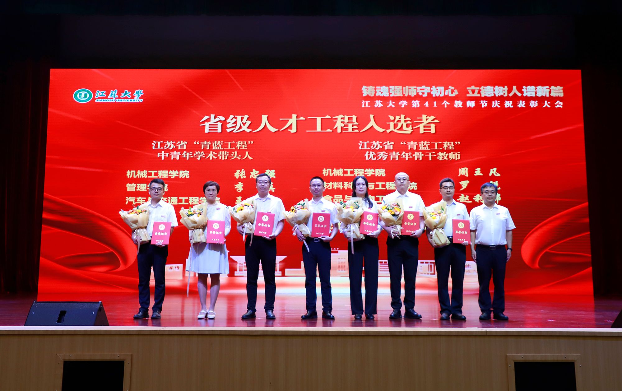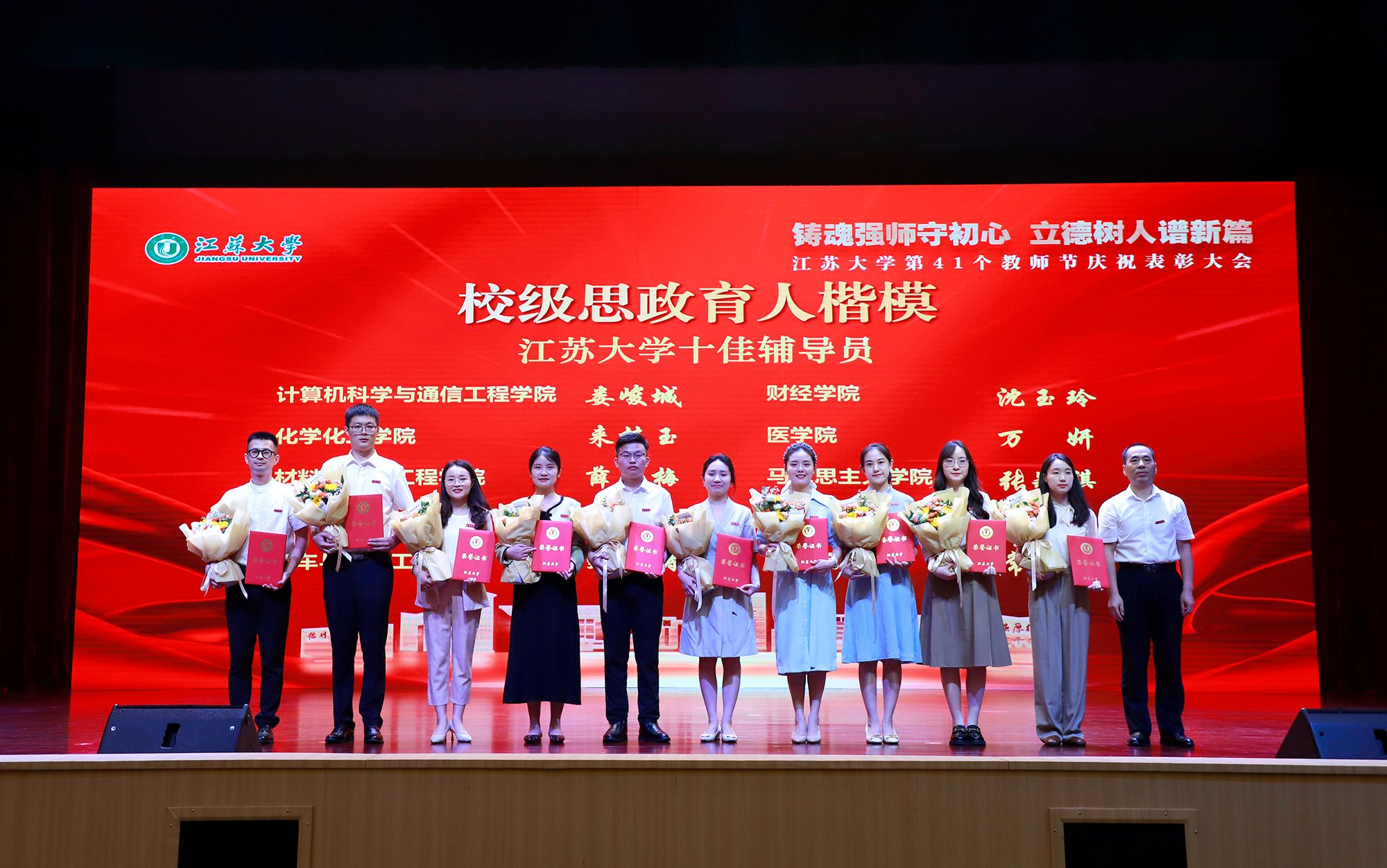 表彰环节,李洪波为国家级重要荣誉获得者颁奖,张济建为国家级、省级教学能手颁奖,陈红、邹小波、王景全为省级人才工程入选者颁奖,杜永春为师德师风先进典型颁奖,杨敬江为多宝网页版十佳辅导员颁奖,吴麟麟为多宝网页版最受学生欢迎的十佳教师颁奖。