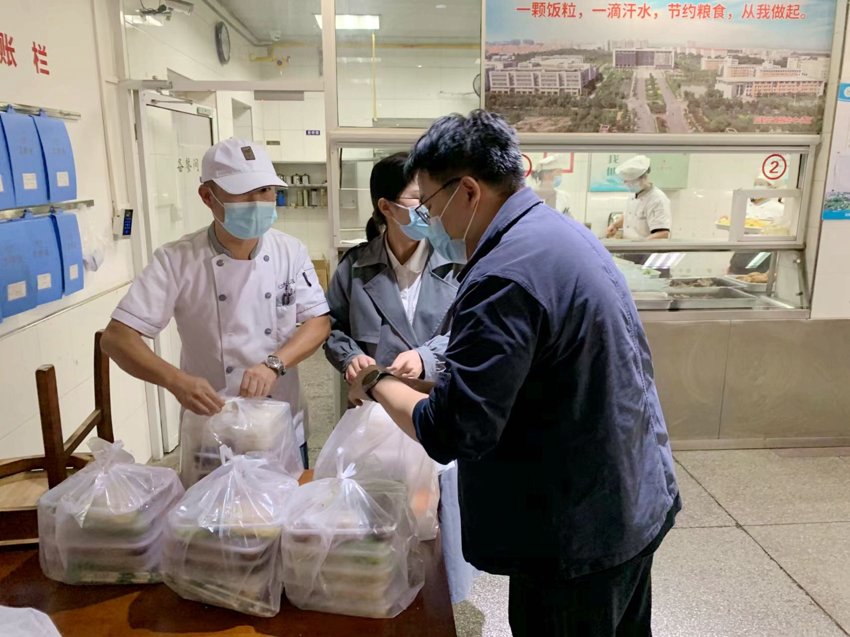 9月28日上午,在电气学院疫情防控志愿者群中,“各位老师,午餐时间有4个时间段,请绿码的4位老师报名一起去食堂买饭送餐。”通知一经发出,立刻得到了学院教师和辅导员的回应。一餐餐热气腾腾的饭菜就这样传递到了滞留学生的手中。