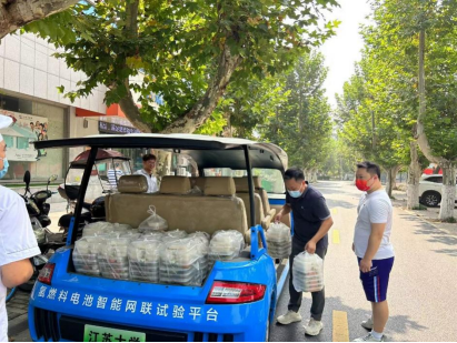 汽车与交通工程学院此次静态管理的学生有202人,教职工志愿者使用家用车一日三次送餐,后备箱容量有限,开关车门、上下取餐极不方便。得知这一情况,该院院长、燃料电池发动机研究所带头人尹必峰提议,利用研究所自主开发的氢燃料电池观光车作为送餐交通工具。