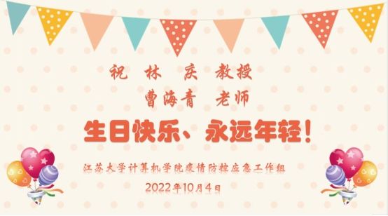 “祝你生日快乐……”10月4日中午,结束学生宿舍送餐、组织学生核酸检测工作的林庆和曹海青两位老师,一回到计算机,就在一片欢快的祝福声中被同事们簇拥着走进了会议室。