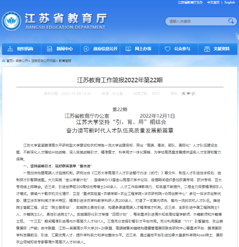 12月8日,江苏省教育厅《江苏教育工作简报》(2022年第22期)以《多宝网页版坚持“引、育、用”相结合 奋力谱写新时代人才队伍高质量发展新篇章》为题,从坚持战略引才,筑好群英荟萃“蓄水池”;坚持精准育才,厚植全面成长“好沃土”;坚持科学用才,彰显才尽其用“大作为”三个方面,专题报道了我校人才工作的思路、举措与成效。