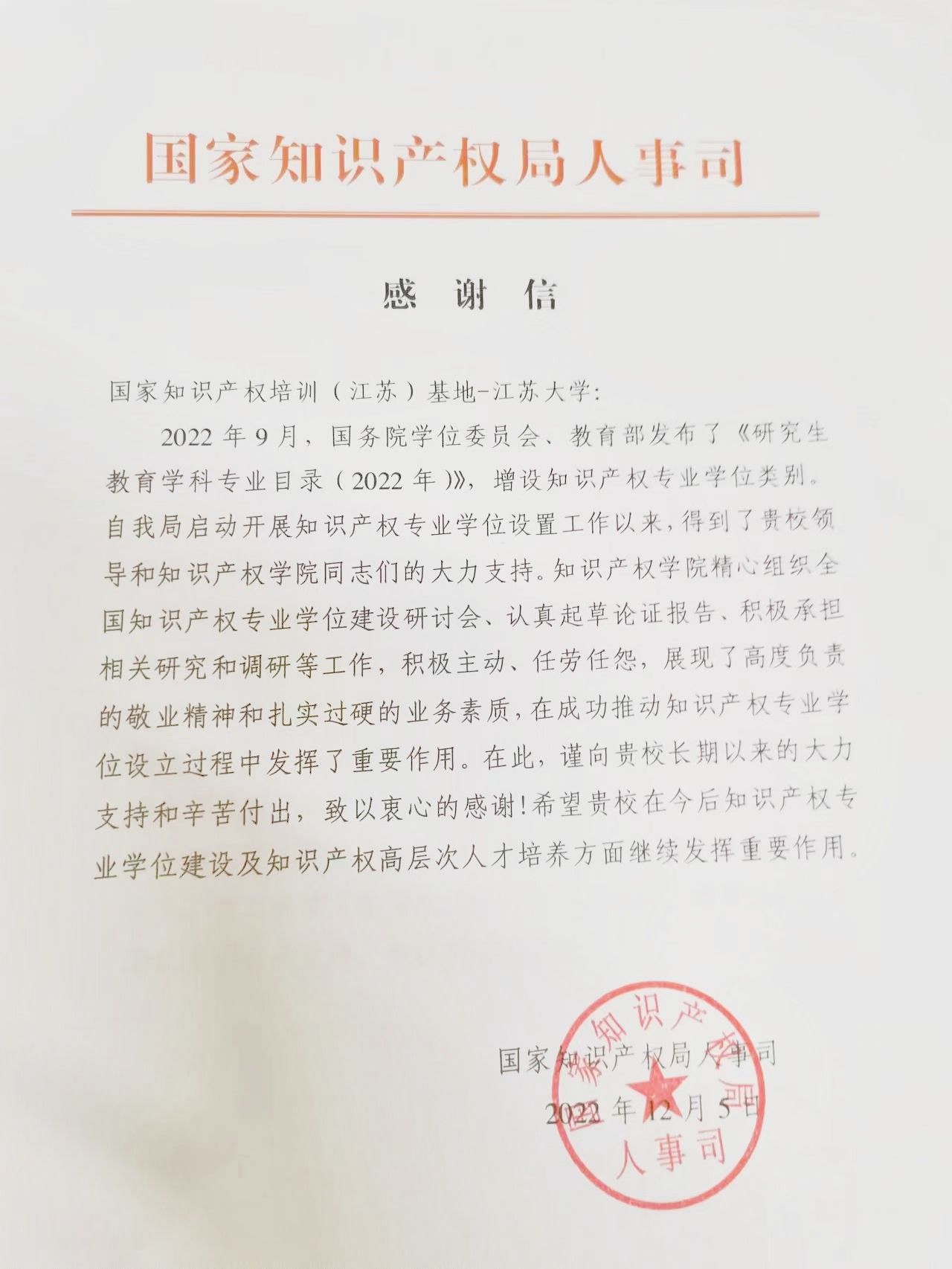 日前,国家知识产权局人事司向学校发来感谢信,感谢多宝网页版在知识产权专业学位申请设立工作中的辛勤付出和工作成效,并希望学校在知识产权专业学位建设及知识产权高层次人才培养方面继续发挥重要作用。