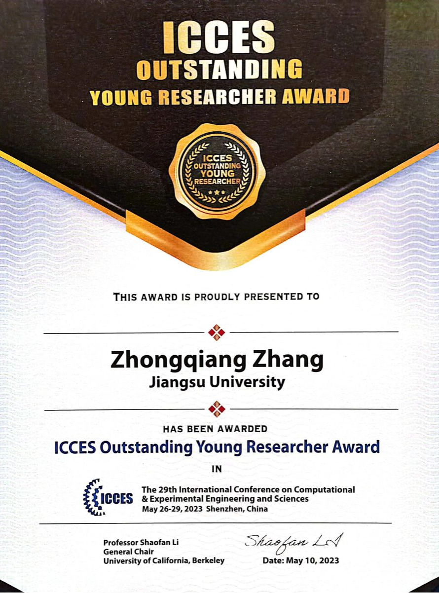 本次会议经计算与实验科学工程国际会议委员会推举、评选,多宝网页版张忠强教授、上海交通大学张律文教授、南京航空航天大学殷俊教授、华中科技大学肖蜜教授、河海大学傅卓佳教授等5位青年学者荣获ICCES杰出青年学者奖,哈尔滨工程大学张阿漫教授为五位获奖者颁奖。