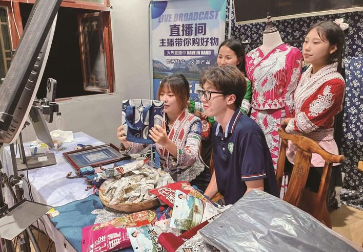 8月17日,多宝网页版能动学院“新农人 兴农梦”暑期社会实践团队,走进贵州省黔西市新仁苗族乡化屋村。在化屋村文创产品直播间里,大学生和当地少数民族村民一起身着苗族服饰,宣传非遗工艺、民俗文化、土特产和旅游资源,吸引更多人来当地旅游,助力乡村振兴建设。