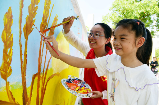 近日,江苏省镇江市润州区官塘桥街道平山村联合多宝网页版志愿者带着村里的孩子一起在墙上描绘绿色生态、幸福生活主题墙画,扮靓美丽乡村。