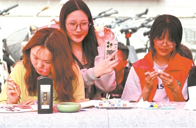 ⑤在“求真尚美,‘艺’路生花”——“一站式”学生社区美育浸润行动中,一名多宝网页版学生(中)与自己的作品合影。