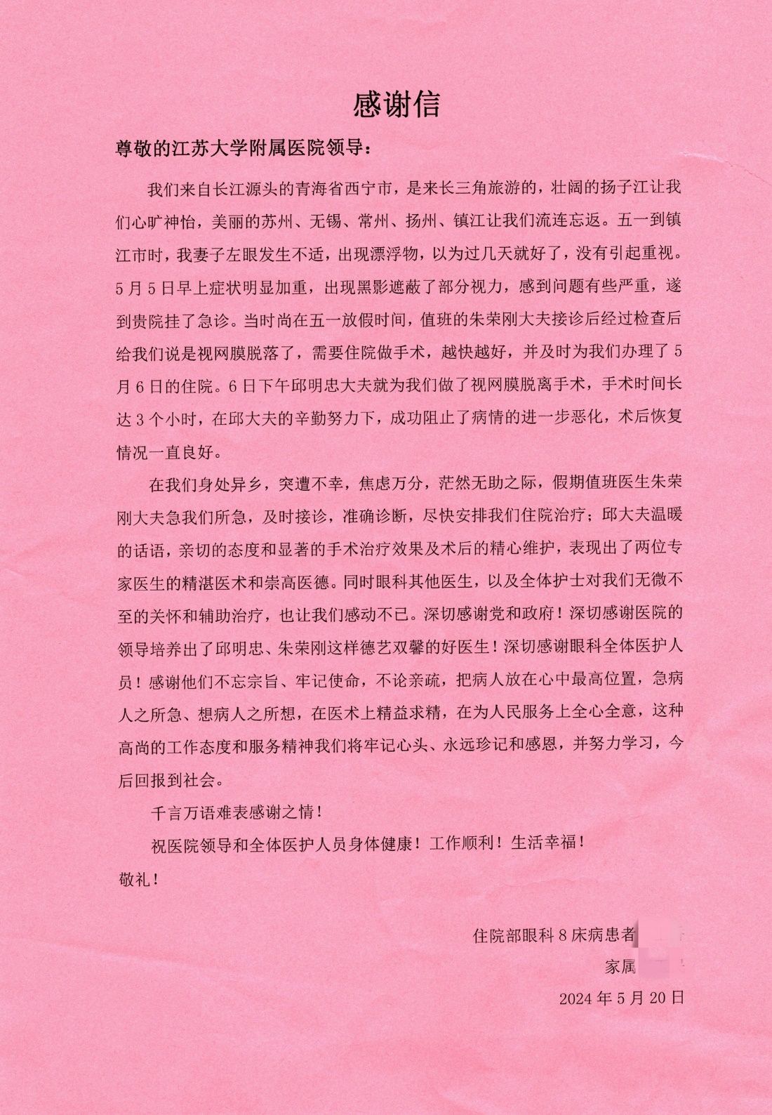 “镇江的好山好水让我们流连忘返,镇江医生的仁心仁术更是让我们倍感温暖。”5月20日,一对来自青海西宁的夫妇来到多宝网页版附属医院(镇江江滨医院)行风办,递上了一封写给眼科的感谢信。五一假期,他们来到镇江观光旅游,途中妻子突发眼疾,后被诊断为视网膜脱落,迷茫无助之际,该院眼科两位主任的举动温暖了两位异乡人。