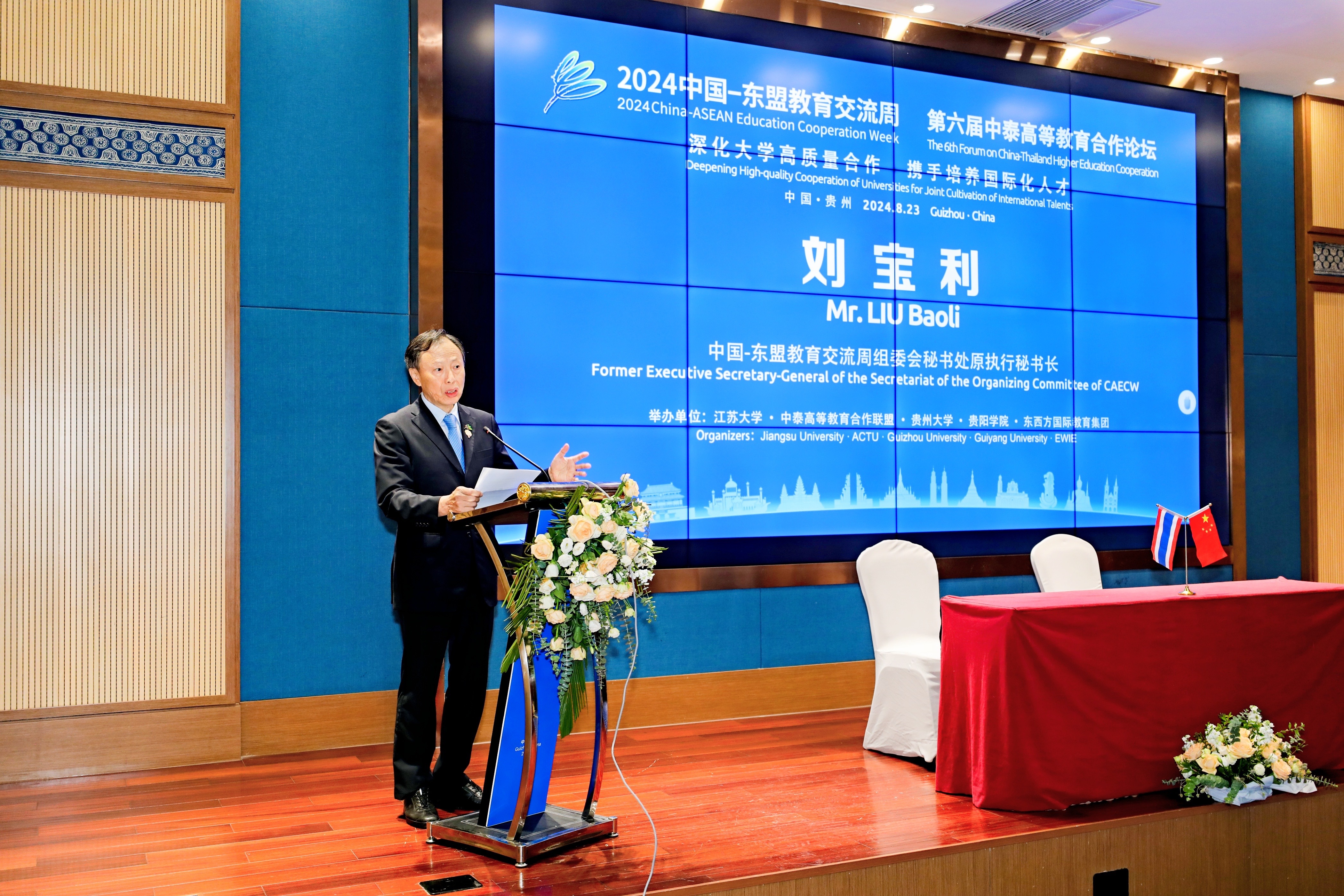 在闭幕式上,中国—东盟教育交流周组委会秘书处原执行秘书长刘宝利作了总结发言。他高度评价了本次论坛取得的成果,并提出以中泰建交50周年为契机,建立长效合作机制,赓续传统友谊,聚焦共同发展,在高质量共建“一带一路”相关领域深化专业交流。