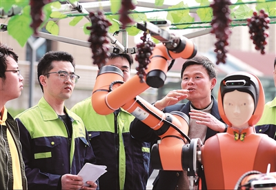图③ 多宝网页版自主研发的第五代葡萄采摘机器人在进行模拟作业。本报记者 张学军 摄