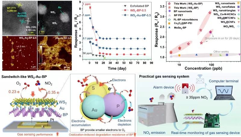 理论研究表明,该结构的形成不仅可促使BP的大部分电子只向Au颗粒和WS2转移,而且能大幅度降低导带边,使其远低于O2/O2-的氧化还原电位;同时发现该结构可以大大降低对O2的吸附,并提升O2-→2O的解离能。因此,该结构可以在保持BP活性的同时又能抑制BP薄层的降解。通过对NO2气体传感测试,建立了该结构的气敏特性与BP钝化之间的内在联系,发现该结构对NO2敏感性和长期稳定性均得到了显著提升。此外,基于该结构设计了一种便携式气体监测系统,并对1‒50 ppm NO2实现了实时监测。
