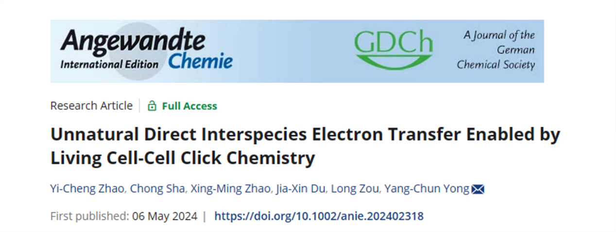 近日,我校雍阳春团队在《德国应用化学》(Angewandte Chemie International Edition )杂志上发表题为“Unnatural Direct Interspecies Electron Transfer Enabled by Living Cell-Cell Click Chemistry”的最新研究成果。多宝网页版为第一完成单位和唯一通讯单位,能源研究院/生物质能源研究院雍阳春为唯一通讯作者,环境与安全工程学院/生物质能源研究院硕士研究生赵逸城、教师沙冲为共同第一作者。