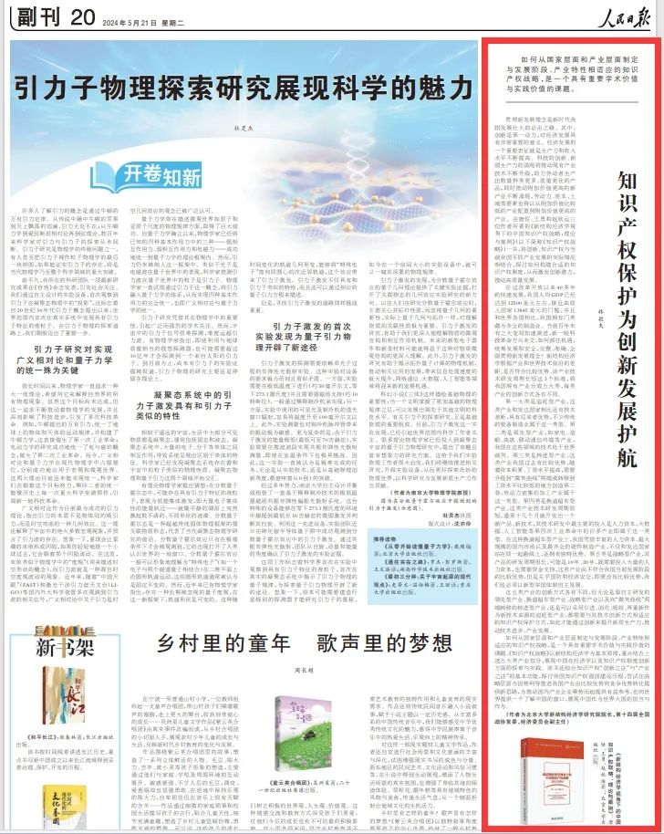 5月21日,北京大学新结构经济学研究院院长,第十四届全国政协常委、经济委员会副主任林毅夫教授在人民日报撰文《知识产权保护为创新发展护航》,向社会各界推荐由多宝网页版知识产权学院直属党支部书记、新结构经济学知识产权研究院执行院长唐恒教授,以及北京大学新结构经济学研究院学术副院长王勇、赵秋运博士合著的《新结构经济学视角下的中国知识产权战略:理论与案例》一书。