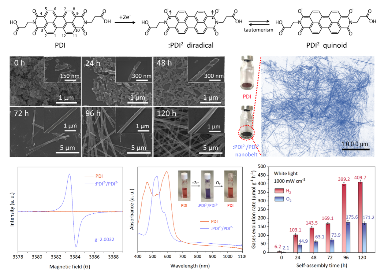 研究工作将苝酰亚胺(Perylene diimide,PDI)转变为能够在模拟太阳光下全分解水的全有机光催化剂。通过将PDI自由基(:PDI2-)和其醌式异构体(PDI2-)自组装合成自由基全有机半导体催化剂,利用其内部相邻自由基分子的电子自旋耦合,可以诱导特殊的三重态聚变上转移过程,从而产生能够与水分子作用的S1激发态。自组装形成的自由基-醌式杂化分子(:PDI2-/PDI2-)纳米带在光激发过程中能够通过自旋耦合产生较长寿命的三重态激子,使其在AM 1.5G模拟太阳光下将水分解为氢气和氧气,在450 nm~850 nm波长范围内的平均表观量子效率(AQY)为1.5%,太阳能氢能转换效率(STH)为0.0806%。该研究是首个不含金属的全有机光催化全分解水反应体系,这种全有机自旋杂化结构为设计一系列用于光催化、太阳能电池、传感器和发光材料的全新光响应有机半导体提供了新途径。