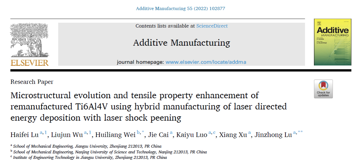 近日,经初评推荐、资格审查、专业评审、综合评审等程序,机械工程学院鲁金忠教授团队发表在《Additive Manufacturing》上的SCI高被引论文“Microstructural evolution and tensile property enhancement of remanufactured Ti6Al4V using hybrid manufacturing of laser directed energy deposition with laser shock peening(激光热力交互沉积再制造Ti6Al4V合金微观组织演变和拉伸性能强化)”入选2024年江苏省自然科学百篇优秀学术成果论文推选(多宝网页版唯一入选)。青年教师卢海飞副教授为第一作者,鲁金忠和南京理工大学韦辉亮教授为共同通讯作者。该工作得到国家自然科学基金(51775250)等资助。